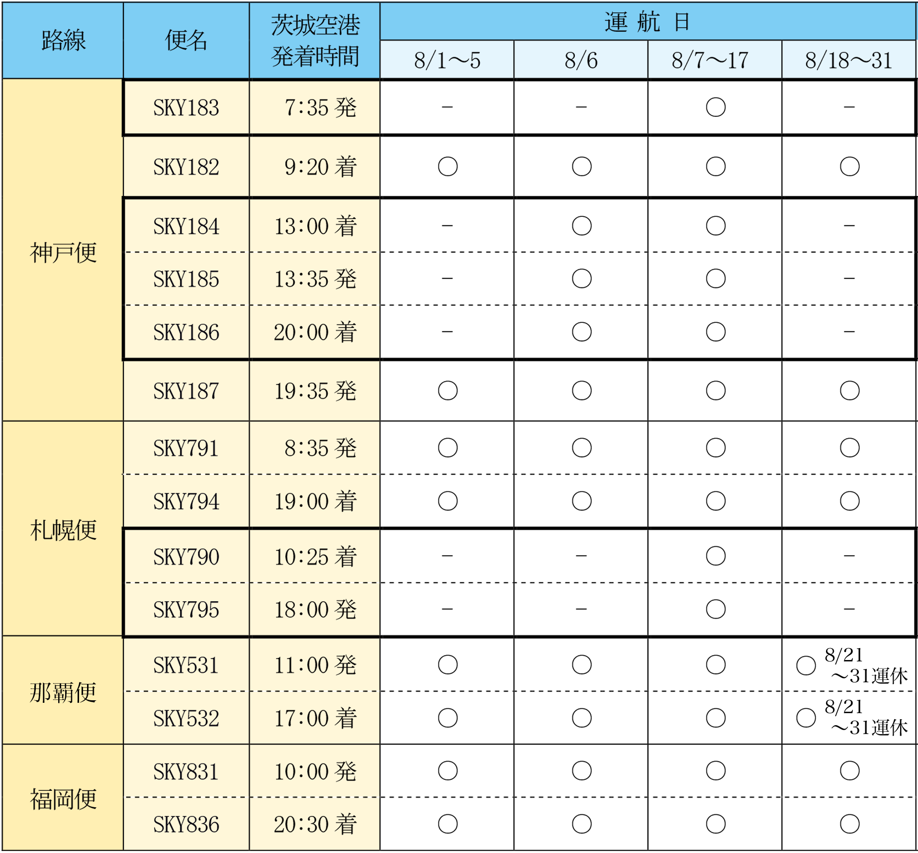 | 便名Flight No.航班号航班號碼편명 | 茨城空港 発Departure出发出發출발 | 目的地 着Arrival到达抵達도착 | ||