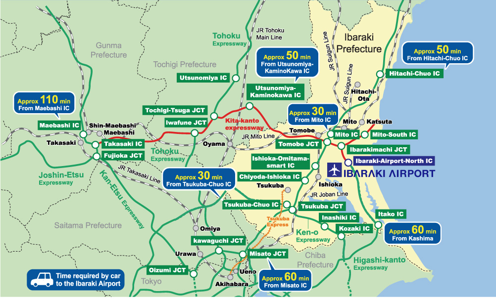 Limousine bus service from Mito Station and Ishioka Station is convenient. Limousine bus service between Tokyo Station and Ibaraki Airport is also available.