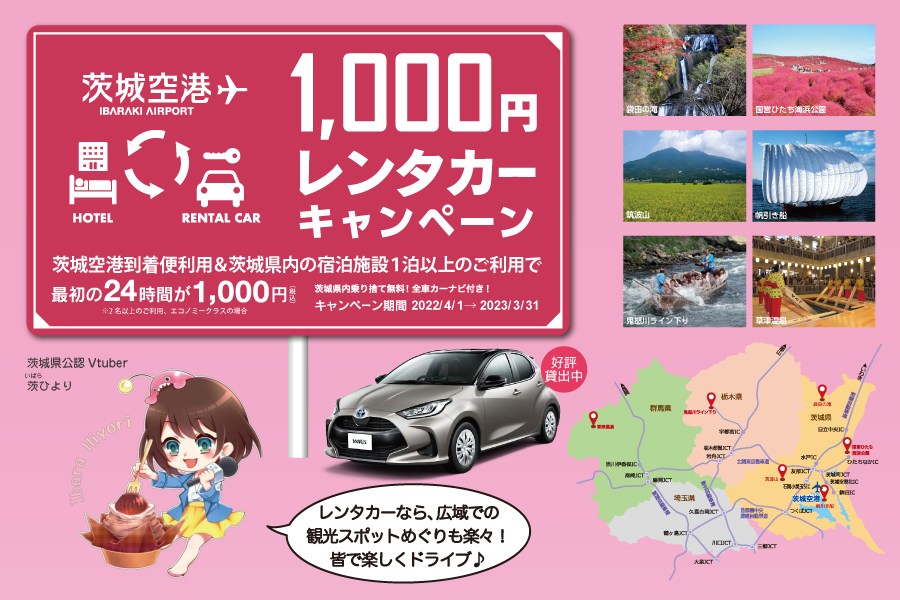 キャンペーン期間中、茨城空港到着便を利用し、到着当日にレンタカーを借りられる方で、茨城県内の宿泊施設を1泊以上ご利用される場合に、レンタカーの基本料金がキャンペーン価格でご利用いただけます。この機会にお得なレンタカーをご利用ください。