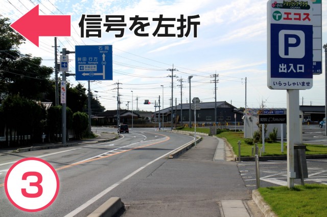 県道144号線を10分弱ほど道なりに直進。「川戸西」交差点を右折(県道359号線)。左手にコンビニ「セブンイレブン」が目印です。