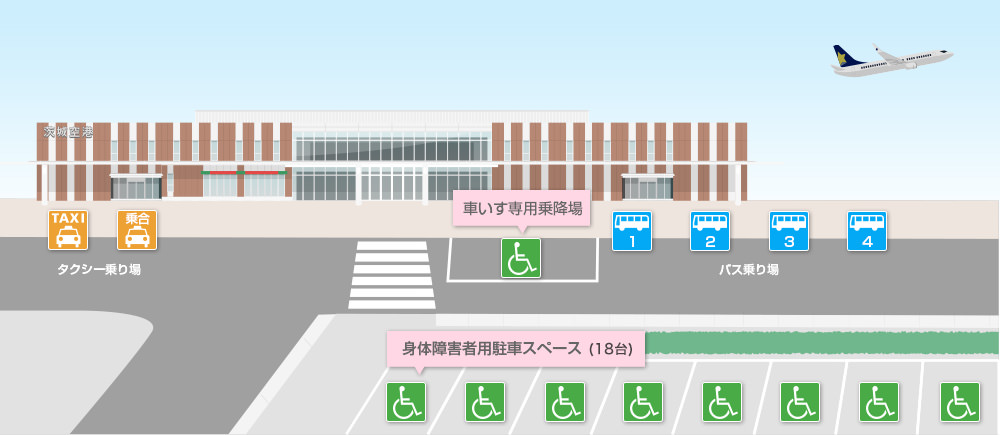 ターミナルビル前、横断歩道付近に車いす専用の乗降場を設けています。