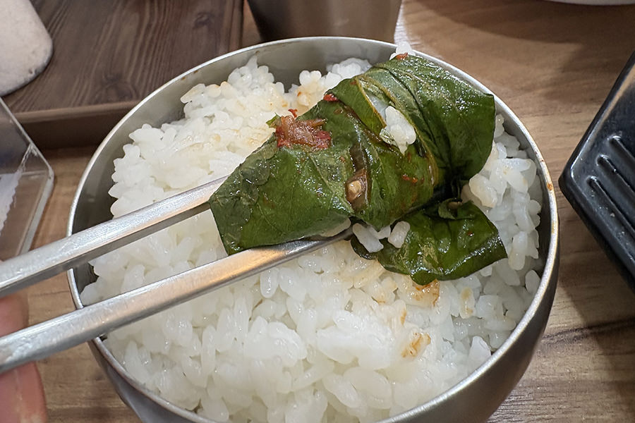 ドラマで見たようにエゴマの葉でご飯を巻きます。