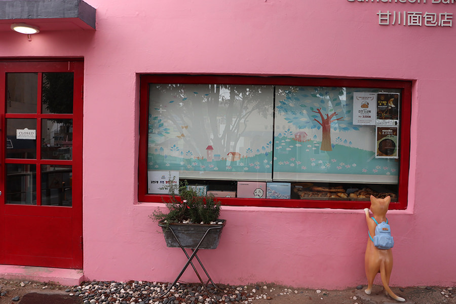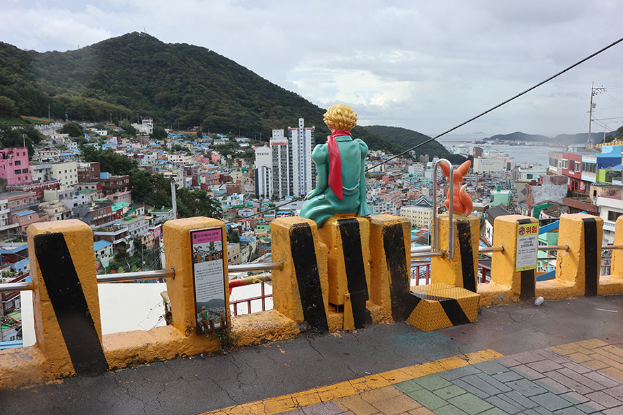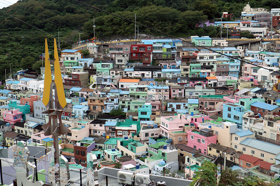 村の最上部にあるハヌルマル展望台からは、甘川文化村を一望でき、カラフルな家々の階段状の並びや釜山の街並み、さらに遠くには海まで見渡せます。壁などに描かれたストリートアートや路地のあちこちに猫のオブジェも多く、かわいらしい雰囲気の中で散策を楽しめるスポットです。