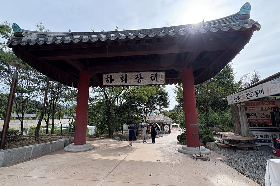 門の所から河回村の入口まで無料シャトルバスが運行されています。