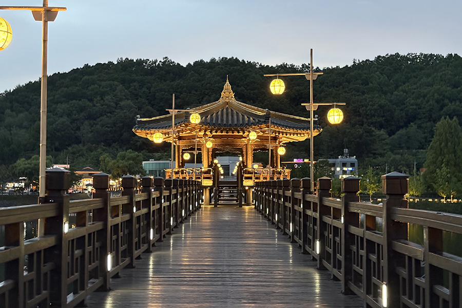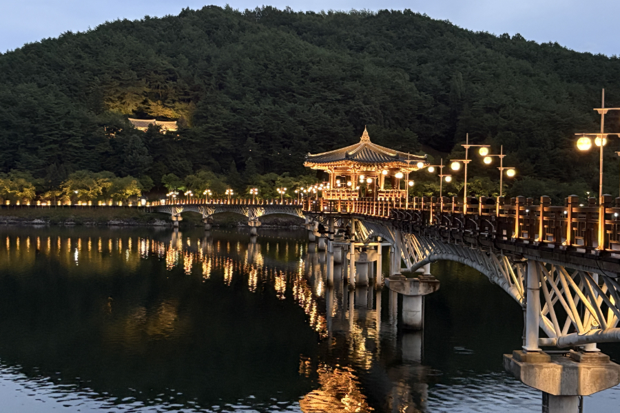 安東ダム近くにかかる月映橋は、全長387メートルの歩行者専用の木製橋です。中央には休憩所の月映亭があり、橋の上からは洛東江の景色をゆったりと楽しむことができます。夜間にはライトアップされ、光が水面に映る幻想的な風景が広がります。