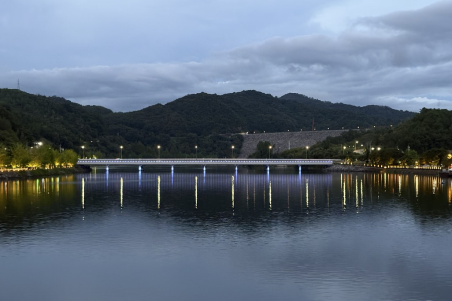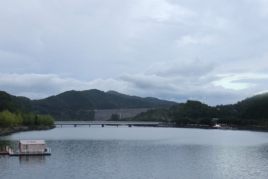 まだ完全に日が暮れていないため、安東ダムが見渡せます。