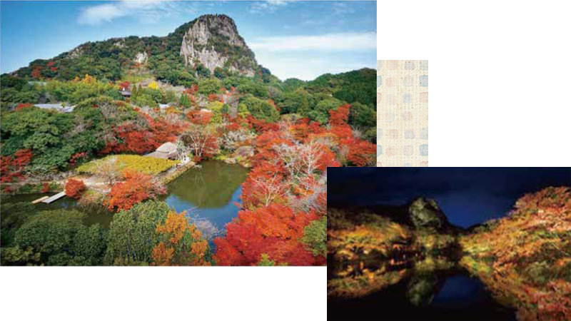 標高210mの御船山の南西麓にある池泉回遊式庭園です。広大な庭園には約2千本の桜や、20万本のツツジなどおよそ140種類の木々を植栽しております。