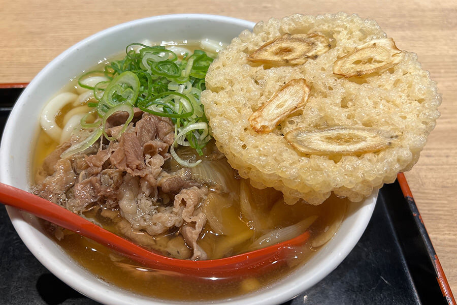 ふにゃっと太く柔らかい麺とアゴやイリコ、鰹節、昆布などをぜいたくに使っただしに、薄口しょうゆを加えたやさしい味。ごぼう天は博多うどんならではのトッピング。