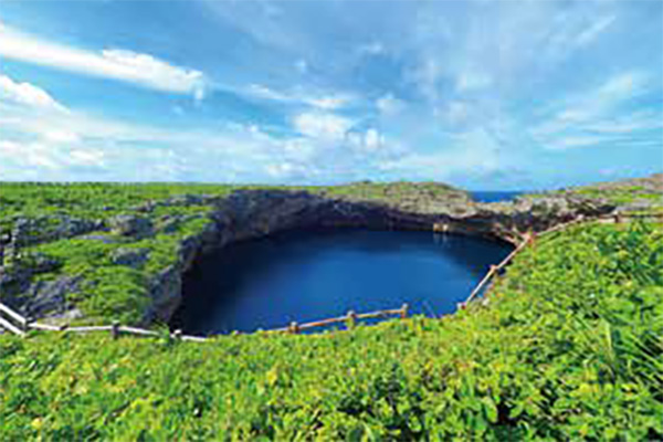 大小二つの円形の池が水面下でつながり、さらに海側の池は、海と通じているという神秘的な池。海岸にある鍾乳洞が波の侵食で大きくなり、天井が崩落して形成されたものと推測されており、国の名勝、天然記念物にも指定されています。また、上級者向けダイビングスポットとしても人気です。