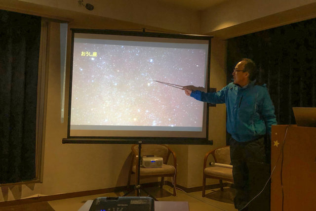 夕食後、向かったのは…「森のソラニワ」のお隣にあるもう一つの宿「緑の風リゾート きたゆざわ」にある「緑の風天文台」です。なんと、ホテルの屋上には天体望遠鏡が3台設置されており、天体観測ができちゃうんです!人工的な灯りが少ない北湯沢は、夜空に浮かぶたくさんの星たちの輝きが綺麗に見える場所なのだそう。冬は空気が澄んでいるので、夜空に明るく輝く星たちがことさらに美しく見えるとのことです。私たちが行った日は、残念ながら曇り空。星たちを見ることはできませんでしたが、職員さんによるスライドショーでの楽しい解説を聴くことができただけでも大満足。十二星座にまつわるお話を聴くこともできます。自分の星座を見たい方、誕生月の約4ヶ月前の空に現れるそうです。その時期を狙って行ってみては!