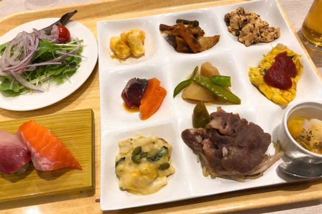 夕食はビュッフェスタイルで、好きなものを好きなだけ食べられます。さすがは北海道。海鮮から野菜、お肉に至るまで、どれも新鮮で美味しそうな料理ばかり。目の前で調理してくれる実演形式のメニュー(ステーキ・天ぷらなど)や、目にも楽しい色鮮やかな野菜たちが並んだサラダコーナー。エゾジカマイスターに認定された総料理長プロデュースのエゾジカ料理から、種類豊富なデザートまで…どれを食べようか、悩んで迷って…そんな時間も楽しい。結果、お皿いっぱいに盛り付けてしまいました(笑)まだまだメニューはたくさんありましたが、それは次回のお楽しみということで。ごちそうさまでした。