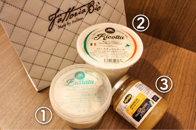 - ①ファットリアビオ一番人気の「ブッラータ」