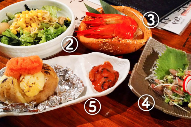 ①つっこ飯 ②はちきょう流ラーメンサラダ ③北海しまえび ④にしんたたき ⑤はちきょう流じゃがバター