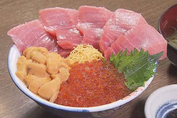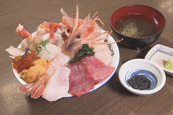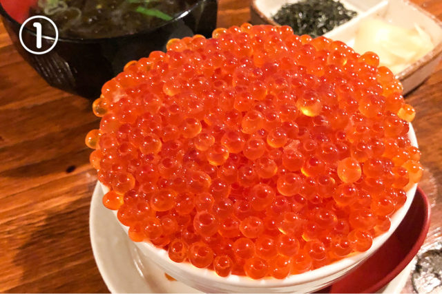 名物は何と言っても、「つっこ飯」。ごはんを盛った丼に、店長さんが「おいさ~!」の掛け声とともに大粒でキラキラと輝くイクラをかけてくれます。店長さんに合わせて、店員さんも「おいさ~!」と盛り上げます。目の前でイクラが山のように積み上がり…最後は丼からこぼれ落ちるほどに。これぞ、「イクラこぼれ盛り」です。