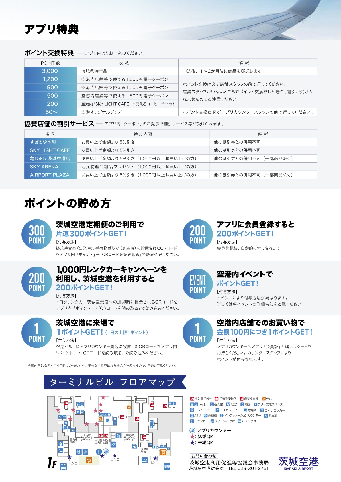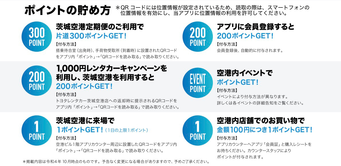 1日の上限1ポイント)。空港ビル1階アプリカウンター周辺に設置したQRコードをアプリ内「ポイント」→「QRコードを読み取る」で読み取りください。