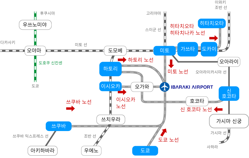 미토역, 이시오카역 등에서는 연결 버스가 편리합니다. 또한, 항공기 이용 승객은 도쿄역.