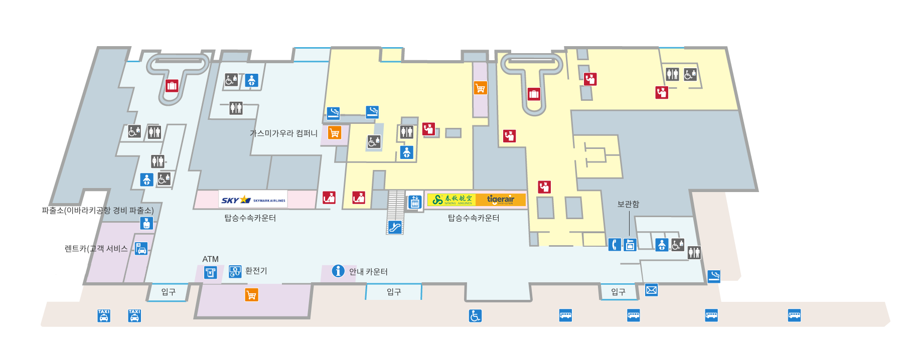 터미널 빌딩내에는 편히 쉴 수 있는 레스토랑과 카페를 비롯해 일용품에서 기념품까지 판매하는 각종 매점들이 있습니다.