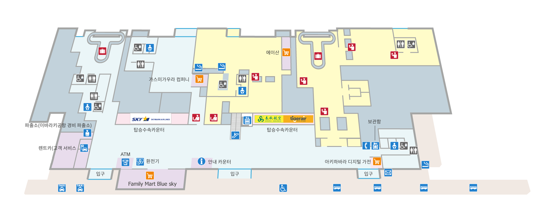 이바라키공항 터미널 빌딩은 단순하고 컴팩트합니다. 탑승이나 도착 수속 모두를 1층에서 완결하는 알기 쉬운 구조입니다. 빌딩내에서의 이동 거리가 짧기 때문에 고령인 분이나 어린이를 동반한 분도 쾌적하게 탑승ㆍ도착 수속을 할 수 있습니다.