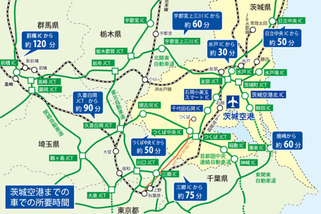 お車の場合、水戸市から約35分、つくば市から約45分、県外からも宇都宮市から約65分、さらにはいわき市から約100分とアクセス良好!