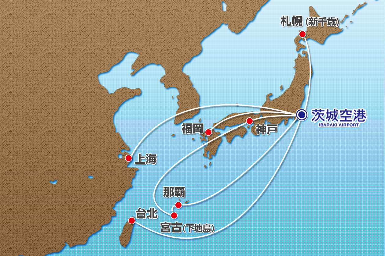 茨城空港は北関東の空の玄関口として、札幌・神戸・福岡・那覇の国内主要都市、上海・台北のアジア各都市へと就航しています。