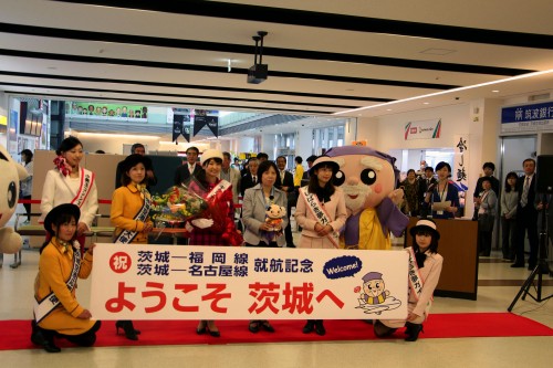 4月18日(金)より、スカイマーク社が、「茨城—福岡線」「茨城−名古屋線」の運航を開始しました。 それぞれの初便で、名古屋からは、「キラッ都なごやメイツの澤田 愛利子(さわだ えりこ)さん」らが、福岡からは「福岡親善大使の岡村 真由(おかむら まゆ)さん」らが来県し、空港ターミナルビルにおいて、茨城県の山口やちゑ副知事、楠田幹人副知事、いばらき夢ガイド、茨城空港応援大使、ハッスル黄門らが出迎え、就航セレモニーが開催されました。