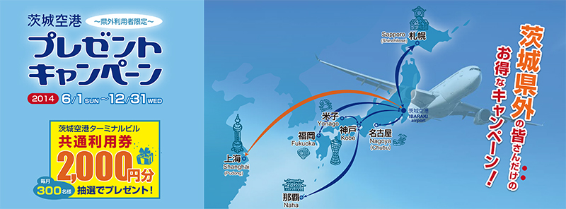 茨城空港は開港5年目を迎え、茨城空港のさらなる利用圏の拡大を図るため、茨城空港の県外利用者に対する期間限定のプレゼントキャンペーンを、6月1日(日)より開始します。