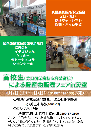 | 内容 | ・真壁高校(8月2日・3日):かぼちゃ・トマト・乾麺・ジャムなど ・鉾田農高(8月2日のみ:イチゴジャム、クッキー、ガトーショコラ、シホンケーキ |