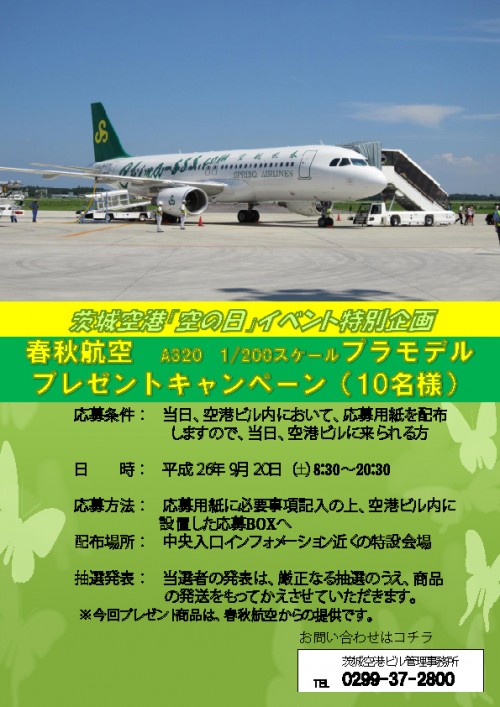 9月20日(土)に茨城空港にて開催する『空の日』イベントの一環として、飛行機のプラモデルのプレゼントキャンペーンを実施します。