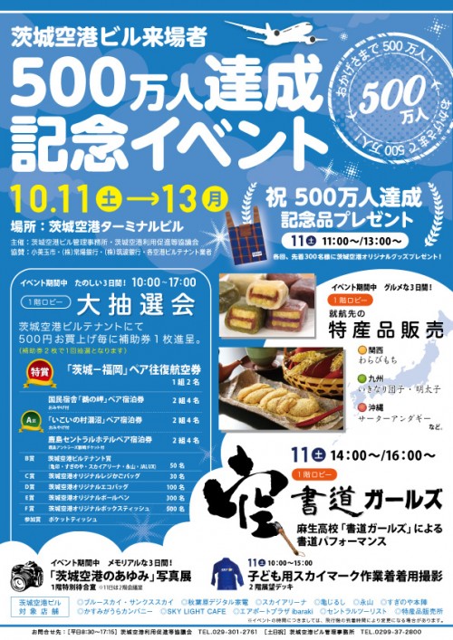 茨城空港では、まもなく開港以来の来場者数が500万人に達することが見込まれることから、これを記念して、10月11日(土)から13日(月)まで、記念イベントを開催します。