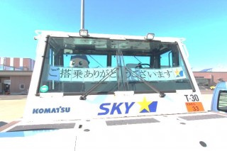 空港内の特殊車両に乗車した特大のハッスル黄門が、出発するお客様をお見送りいたします。