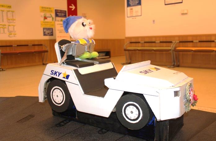 国内線手荷物受取所のターンテーブルの上で、手作りの空港特殊車両のオブジェに乗車したハッスル黄門が到着するお客様をお出迎えいたします。