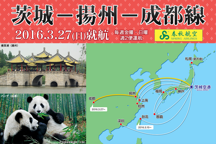 平成28年3月27日(日)より、春秋航空の「茨城-揚州(ようしゅう)-成都(せいと)線」が新たに就航することとなりました。