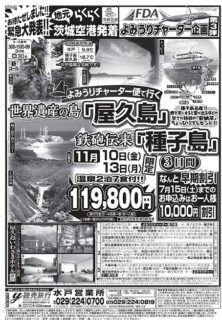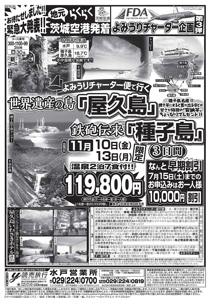 また、本チャーター便を利用した、種子島と屋久島を周遊する2泊3日の旅行商品の販売が開始されましたので、併せてお知らせいたします。