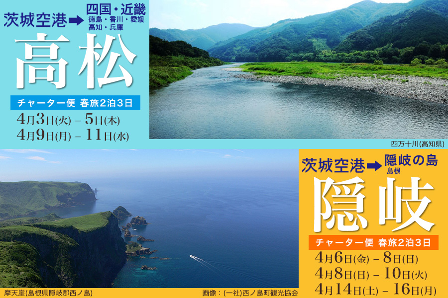 なお、茨城空港から高松、隠岐へのチャーター便の運航は、いずれも初めてとなります。