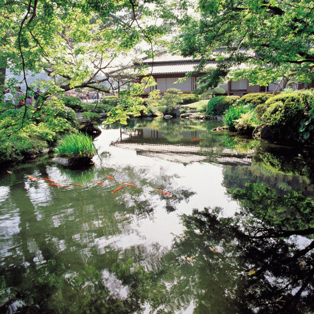 万治元(1658)年、19代薩摩藩主島津光久によって築かれた別邸です。錦江湾や桜島を庭園の景観にとりいれた雄大な景色が最大の魅力で、幕末の名君・28代島津斉彬がこよなく愛し、徳川将軍家に嫁いだ篤姫も足を運んだといわれる、鹿児島屈指の名勝地です。