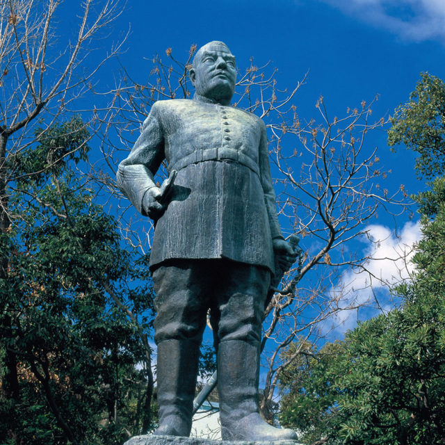 江戸城無血開城や明治新政府樹立など、明治維新に最大の功績を残した「西郷どん」。その没後50年を記念し、鹿児島市出身の彫刻家で渋谷の「忠犬ハチ公」の制作者・安藤照が製作した銅像。城山を背景に仁王立ちする、高さ8メートルの堂々たる立像です。