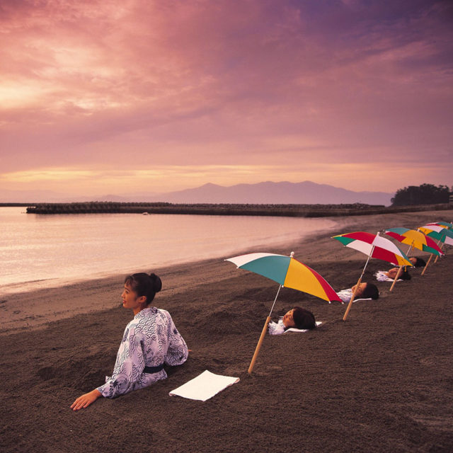 浜辺に横たわり、湧き出す温泉で温められた砂をかぶせる、世界的にも珍しい指宿の「砂むし温泉」。きりきず、末梢循環障害、冷え性、うつ状態、皮膚乾燥症などに効能があるといわれ、極上のリラクゼーションを味わうことができます。