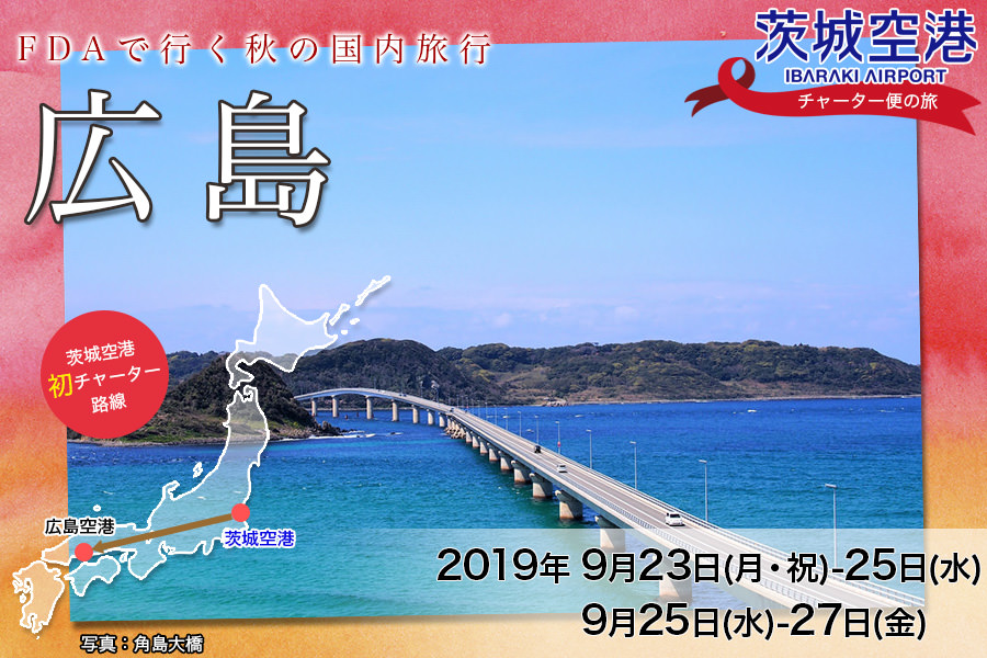 この度、フジドリームエアラインズ(FDA)による「茨城−広島」を結ぶチャーター便が運航されることになり、下記のとおり本チャーター便を利用した旅行商品の販売が開始されましたのでお知らせします。