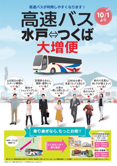 10月1日(火)から,高速バス「水戸⇔つくば」「茨城空港⇔つくば」の増便運行が開始され、通勤・通学、ビジネス、観光など、ますます便利になります!ぜひご利用ください。