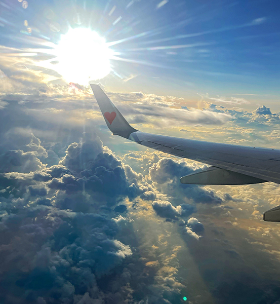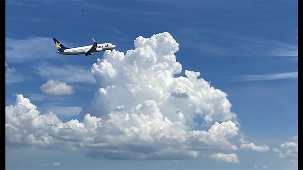 太陽の光をうまく利用して、雲の陰影がくっきり映っている素敵な作品ですね。スカイマークの飛行機に乗った人しか撮影できないハートマークのウイングレットも入っている場面で、空の旅の美しい部分を切り取った『映え』写真ですね!!