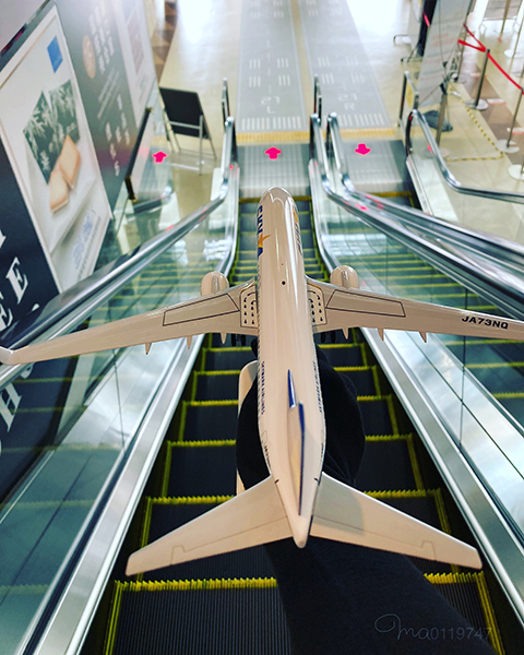 エントランスからエスカレータの動線にランウェイが!自宅で大切に飾っていたSKYMARKのモデルプレーンを持参し撮影に挑みました。吹き抜けのエスカレータを下ると本当にヒコーキがランウェイに向かって着陸しているようで、ワクワクしながらシャッターを何度もきりました。エスカレータの矢印を誘導灯に見立てて角度を合わせた所を工夫しました。
