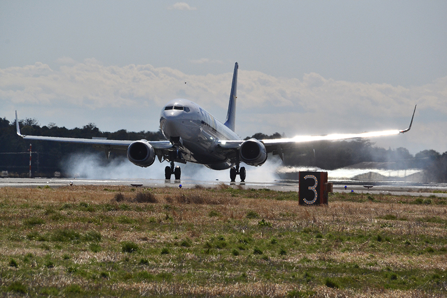 いつも茨城空港を訪れると、「何処か撮影できるところがないか」と探しているところに、偶然、着陸する到着便を目撃し、撮ってみようと思った場所です。 この場所で撮影したときに注意した点は、主に光線状態、機体の位置、フレーミングになります。 手前には畑が広がっていましたので、放射線状に入れてみたら面白いんじゃないかと、広角気味に撮影しました。