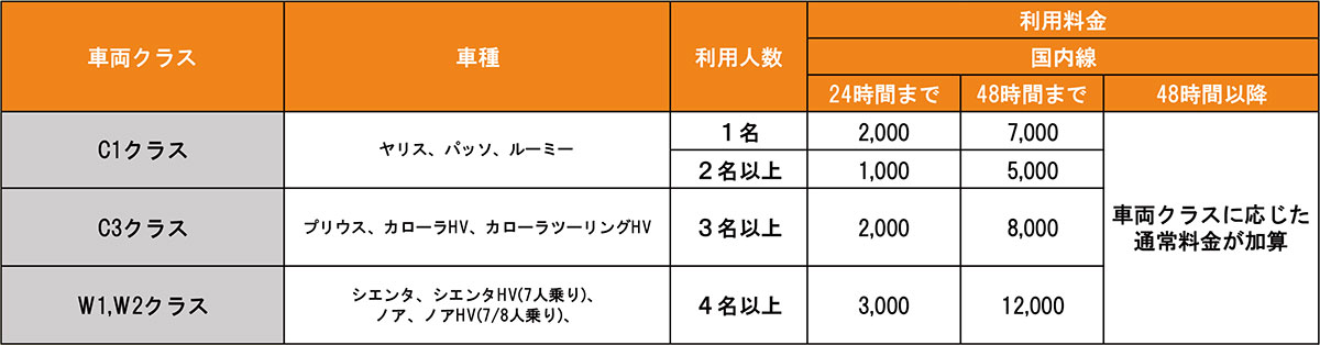キャンペーン期間中、茨城空港到着便を利用し、到着当日にレンタカーを借りられる方で、茨城県内の宿泊施設を1泊以上ご利用される場合に、レンタカーの48時間までの基本料金が以下のキャンペーン価格でご利用いただけます。