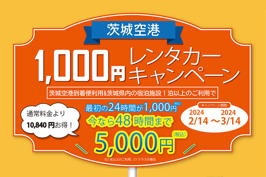 キャンペーン期間中、茨城空港をご利用され、県内の宿泊施設を1泊以上ご利用される場合に、レンタカーの基本料金がキャンペーン価格でご利用いただけます。