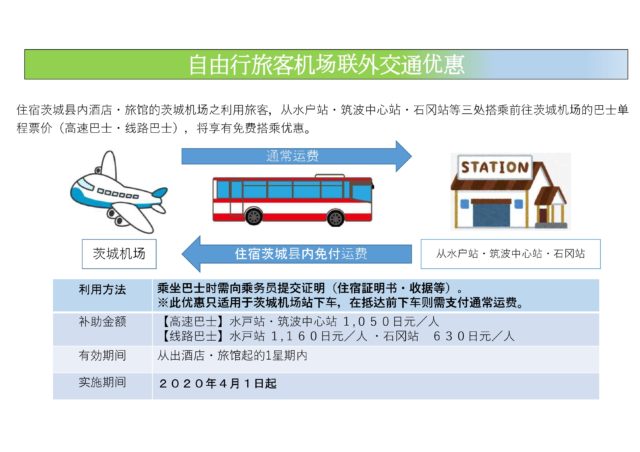 住宿茨城县内酒店・旅馆的茨城机场之利用旅客,从水户站・筑波中心站・石冈站等三处搭乘前往茨城机场的巴士单程票价(高速巴士・线路巴士),将享有免费搭乘优惠。(此方案正在等待议会的许可)。