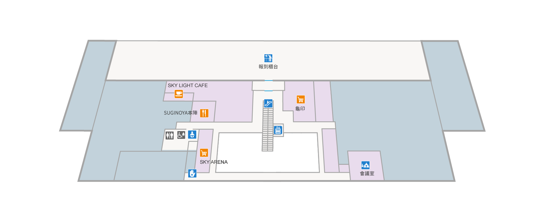 1樓室外、國內線候機室、國際線候機室分別設有吸煙區。由於航站大廈內全館禁煙,欲吸煙時敬請使用上述區域。