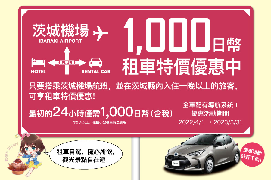 - 1000日幣特價租車活動是僅限於茨城機場店的優惠活動,預約時豐田租車的官方網頁會顯示原價,請先用原價預約,在豐田租車茨城機場店取車時,請告知店員要使用本特價租車優惠活動,然後就能以特價結帳。